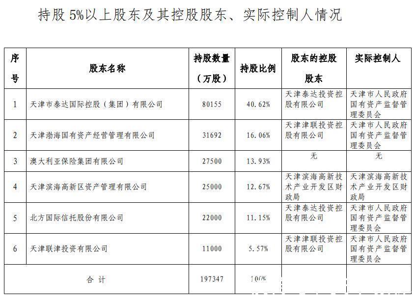 2021年二季度,公司增加注册资本至19.7347亿元,增资后天津市泰达国际控股(集团)有限公司持有公司万股股份,持股比例为40.62%,天津渤海国有资产经营管理有限公司持有公司 万股股份,持股比例为16.06%。